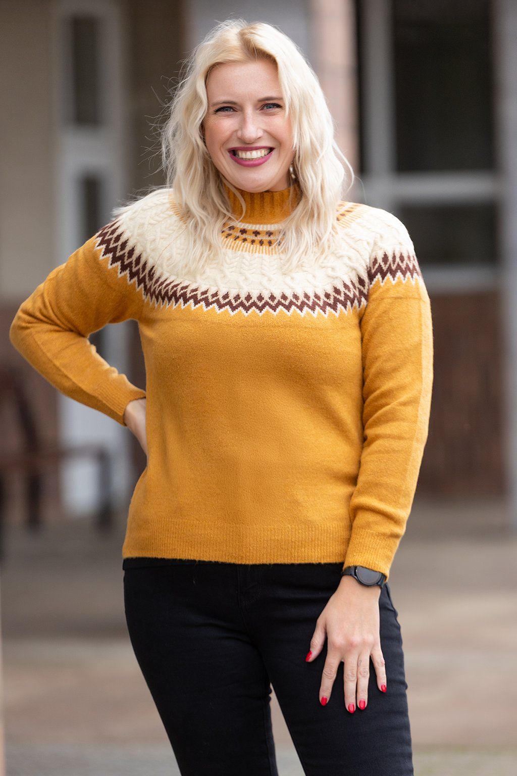Dámský kašmírový svetr JUSTÝNA je jako pohlazení po tvém těle. Zaujme tě svým krásným vzorem, který začíná u krku a pokračuje na přední i zadní straně. Vzor je barevný, má nevšední tvary a můžeš si všimnout i pletených copů. Svetřík má stojáček, který mu přidává na elegantním dojmu. Nádherně ti zpříjemní výjimečné příležitosti. Svetr má volný střih a dlouhé rukávy, krásně pruží po celé své délce a jeho nošení je pro každého příjemným zážitkem. V dolní části je na straně našitá decentní aplikace s motivem mašličky. Dostupný je tento stylový kousek ve dvou velikostech a mnohem více barvách, tak si vyber tu svou vyvolenou.