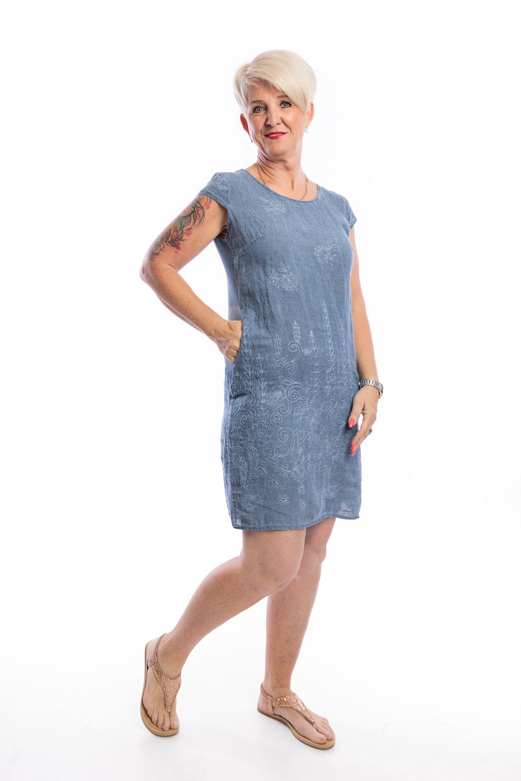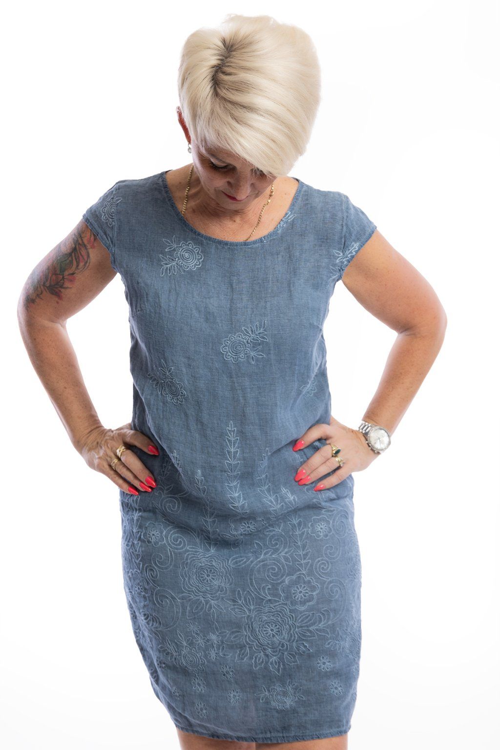 Hledáš pohodlné šaty s osobitým stylem, které tě navíc nadchnou svým materiálem? Jsi tu správně! Lněné šaty LINDA s vyšívaným květinovým vzorem se nejen skvěle hodí do teplých slunečných dnů, ale zároveň působí šik a neokoukaně. Na bocích mají pružnou vsadku, která jim dodává na pohodlí. Na bocích se nachází kapsy. Můžeš vybírat z velikostí M, L, XL, 2XL a 3XL. V nabídce jsou v několika barvách.